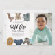 Primeiro convite de aniversário de uma criança bonita e divertida com ilustração de animais safari de girafa, leopardo-da-neve, rinoceronte, leão, elefante e zebra. O texto diz "Wild One". Perfeito para uma festa de primeiro aniversario de menino. Adicione a foto do seu filho também na frente do cartão.