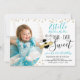 Quatro vezes mais doce que a Bee, quarta convite de aniversário com foto. Adorável convite de festas de 4 anos com um toque de brilho, faux confetti em torno da curva fotográfica. Este terceiro convite de aniversário editou texto preto e dourado com listras douradas na parte traseira da placa, mudando as cores conforme preferido.