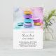 Convite de aniversário com uma fotografia deliciosa com uma pilha de macarões coloridos.