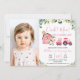Convite de aniversário para fazendas bonitas, com um celeiro cor-de-rosa, trator e arranjo floral. Este convite para fazendas também apresenta uma vaca, porco e galinha e tem espaço para uma fotografia. Este convite é uma forma doce de convidar convidados para uma festa de aniversário temática de fazendas para uma menina.