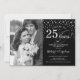 Convite de Aniversário de 25 anos de Casamento com Foto. Design elegante em prata e preto com fonte de caligrafia e confetes de diamantes. Pode ser personalizado para mostrar qualquer ano de casamento. Saúde por 25 anos!