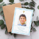 Um fundo branco, decorado com uma estrutura azul-céu, e uma cruz branca Personalize e adicione um nome de foto e detalhes. Texto azul. Quadro fotográfico em forma de arco. Fundo: fundo azul-céu.