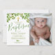 Convites de batismo/ batizado neutros em termos de gênero com um fundo branco clássico que pode ser alterado para qualquer cor, ramos de árvores em aquarela com folhagem verde exuberante, uma cruz dourada religiosa, uma foto de seu filho e um modelo de texto moderno que é fácil de personalizar.
