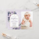 Modelo de convite para fotos de batismo de menina roxa elegante. Este design moderno apresenta flores roxas, cruz dourada falsa e arco num fundo de lavanda de aquarela. NA VERDADE, NÃO FOIL DE OURO. A FOTO DA AMOSTRA NÃO ESTÁ INCLUÍDA. SUBSTITUA POR SUA PRÓPRIA FOTO ANTES DE ENCOMENDAR.