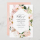 Convite de casamento floral de aquarela com tons de rosa pincelado em uma estrutura geométrica. A foto no verso é opcional. Se você a remover, role para baixo até a parte inferior de "Personalizar este modelo" e clique em "Editar usando a ferramenta Design". Na Ferramenta Design, você pode editar, dimensionar, excluir ou mover qualquer texto ou design elementos desejados.