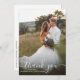 Este cartões de agradecimentos de fotos de casamento na moda apresenta um roteiro moderno que diz "obrigado" em cima de uma foto do casal recém-casado, no verso há uma tipografia moderna para o obrigado que você envia e o endereço de retorno do recém-casado no canto superior esquerdo. Para adicionar suas próprias imagens e detalhes, basta clicar no botão "personalizar este modelo".