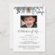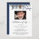 Minhas condolências pela sua perda. Exquisite o anúncio do Serviço Memorial, convite para o lançamento do Serviço Funeral. Uma forma prática e delicada de informar a família e os amigos sobre o funeral ou de reunir planos para celebrar a vida do seu amado falecido. Cartão com uma fotografia amada, mostrada por gracioso arranjo de folhagem azul e verde-sábio e uso de detalhes modernos escritos à mão. Traseira da placa com cor azul elegante do marinho que pode ser alterada para qualquer outra cor que você preferir selecionando personalizar ainda mais. A coordenar o guia de visitas funerárias disponível. Parte do nosso casamento e da coleção de eventos "Montanhas Azuis Russas".