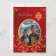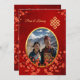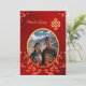Esta versão não tem nenhum título de convite da família. Este elegante convite para o casamento mostra uma foto redonda cercada por galhos florescentes de cereja vermelha e um nó sem fim ouro num fundo vermelho brilhante. Nomes de noiva e noiva em um roteiro clássico elegante.