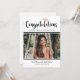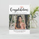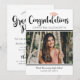 Convite moderno de festa de formatura com “Parabéns” em letra cursiva em negrito, um sotaque de chapéu em rosa dourado e uma foto em largura total. Personalize o nome, escola, ano de formatura e detalhes da festa. O verso combina com a escrita “Festa de Formatura” além de linhas para RSVP, data, hora e endereço.