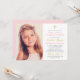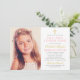 Este elegante convite da Primeira Sagrada Comunhão feito para uma menina apresenta uma foto de 3,5 x 5" de sua filha com na moda cor-de-rosa, ouro e texto de cinza que pode ser totalmente personalizado para seu evento, acentuado por uma cruz de ouro. Uma rosa claro de fundo com um padrão branco de pontos suíços se veste na parte de trás do cartão.