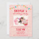 Convite Fotográfico de Festa de aniversário Cinzenta Rosa Brilhante. Convite de aniversário bonito e divertido para uma garota. O design tem lindas bandeiras coloridas de bunting em um fundo brilhante rosa. Personalize todo o texto do convite e insira sua foto no modelo. Este design alegre pode ser usado por várias idades.