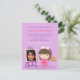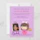 Um convite bonitinho e colorido que é excelente para aquela pintura, artes e artesanatos temem a celebração da festa de aniversário! O convite apresenta uma menina bonita com um arco de bolinhas branco e rosa e vestida com um avental rosa. Ela está segurando uma paleta colorida e uma pintura de pincel na canvas montada no púrpura. Altere a imagem de exemplo para a imagem da aniversariante.