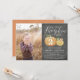 Apaixonem-se por estes adoráveis convites de festas de aniversários de criança rústicos com uma foto favorita no lado esquerdo. A design apresenta "Nossa abóbora está girando" em letras de escrita de caligrafia, com a idade do seu filho inscrita em uma abóbora laranja sobre fundo de quadro. Amostra mostrada para um segundo aniversário. Personalize com seus detalhes de festa de aniversário em letras brancas.