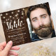 Delicie seus convidados ainda antes da festa começar! Nossos convites de festa de aniversário surpresa combinam elegância e charme, adornados com um fundo de madeira rústica, luzes de corda brilhantes, complementados com uma foto lisonjeira do aniversariante. Um modelo de texto inovador aumenta o apelo estético, elevando assim o seu convite para um novo nível.