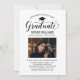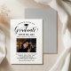 Convite de festa de formatura com a palavra “Graduate” em escrita moderna, ícone de um chapéu e um layout de foto limpo. Estilo minimalista funciona para qualquer cor de escola. Cartão de fundo cinza ardósia mostrado para um acento moderno e neutro. Personalize o nome do formando e todos os detalhes da festa.