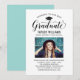Convite de festa de formatura com o estilo moderno de “Formado” com um ícone de gorro e um layout focado em fotos. A tipografia limpa e minimalista mantém o foco no formando. Cartão de fundo azul aqua mostrado para um acento fresco e moderno. Personalize o nome, data, hora e detalhes da festa.