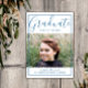 Anúncio de Graduação em Moldes Modernos com um design de borda simples e clássico em azul. As listras finas adoram o verso deste anúncio. Adicione uma foto e detalhes de graduação para personalizar. A cor de fundo no verso do convite pode ser alterada para complementar a foto ou para adicionar uma cor escolar.