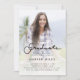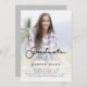 Cartão de convite para fotos de graduação moderna com um script de formando de caligrafia em fundo branco que fará o texto pop. Adequado para o segundo grau ou formando universitário. Pode ser usado como cartões de agradecimentos de graduação ou convite de festas de formando.