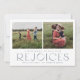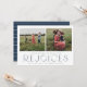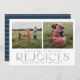 Este Cartões de foto de Natal religioso moderno e mínimo apresenta um sentimento clássico "Uma emoção de esperança, as alegrias do mundo desgastado" junto com duas fotos de sua família. Este design pode ser personalizado com suas próprias fotos e seu nome de família. Este design apresenta cores azul e branca do marinho.
