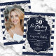 Elegante convite floral feminino de 50 anos com sua foto no final do cartão. Design branco de marinho vírgula com prata brilhante falso. Apresenta faixas marinho azul e branca, rosas brancas, fonte de script e confetti. Perfeito para uma festa de comemoração de na moda adulto. Personalize com seus próprios detalhes. Pode ser personalizado para qualquer idade! Impressos convites Zazzle ou modelo de impressão digital instantânea para download.