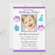Celebre o primeiro aniversario da sua menina com este convite para fotos de aniversário de coruja fofa. Mostrado em azul roxo, rosa e verde. Personalize facilmente as informações da sua festa e a foto da criança.