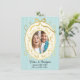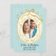Casamento Dourado da Regência Barroca ornamentado Salve a data com fotos de convites para casais. Apresenta uma estrutura decorativa vintage faux gold desenhada à mão com um centro oval de cor creme claro com detalhes do arco. A parte traseira e a frente têm tiras delgadas de pinos azuis-claros. Todos os textos podem ser alterados, exceto "guardar a data". Ouro falso. Perfeito para um castelo de conto de fadas do milênio ou antigo local antigo. Para fazer mais mudanças, vá para Personalizar este modelo. Na parte inferior você verá "Quer personalizar este design ainda mais? Clique em EDIT usando a ferramenta Design. A partir daí você pode mudar algumas fontes e algumas cores, mover coisas ou excluir o que você precisa. Mão desenhada por McBooboos