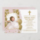 Este belo convite de primeiro aniversário também serve para convidar seus convidados para o batismo da sua garotinha. O primeiro aniversário apresenta uma foto do seu filho num fundo cor-de-água rosa com bolinhas brancas e balões coloridos. Do lado batismo está o texto dourado com a missa e os detalhes da festa em ouro, assim como uma cruz de ouro sobre o confete cor-de-água rosa. Fotografia © Storytree Studios, Stanford, CA
