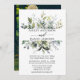 Caligrafia Elegante Moderna Cores Aquáticas Cores Botânicas Cartão de Convite para Casamento inclui folhas de eucalipto, folhagem botânica verde, folhas azuis empoeiradas e outros belos lençóis botânicos. Foto de volta.