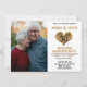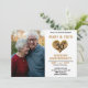 Convite de foto de aniversário de 50 anos de casamento projetado com uma foto favorita do casal e decorado com um coração dourado e detalhes em dourado. O texto inclui: Por favor, junte-se a nós enquanto celebramos, os nomes do casal, Aniversário de 50 anos de casamento, A data, Hora, Localização e nota de RSVP. Para personalizar, basta inserir sua imagem em nosso modelo. Clique em "AJUSTAR" e ajuste a imagem ao lado esquerdo. Em seguida, insira seu texto no modelo, substituindo a amostra. O verso tem um fundo dourado. É rápido e fácil criar um convite inesquecível.