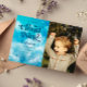 Cartão de convite de aniversário Dreamy com ilustração aquosa do céu azul com estrelas e nuvens. O texto diz "Estamos na Nuvem Nove." Perfeito para o 9º aniversário do seu filho. Você pode incluir uma foto do seu filho neste cartão.