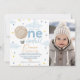 Foto do Balão de Ar Quente Sr. primeiro aniversario Maravilhoso Convite para o balão de ar quente azul-claro, amarelo e bege - branco - primeiro convite de aniversário com algumas nuvens, estrelas, balão de ar quente e posição moderna de caligrafia mono-line. Este é o nosso convite de aniversário do Sr. Magrinho também tem uma foto e é ideal para o primeiro aniversário de um menino.