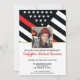 Este convite de festa de formatura apresenta uma bandeira de bombeiros com listras pretas e brancas, e uma fina faixa vermelha de linha também. Personalize com uma foto do bombeiro graduado, que se senta sobretudo nos detalhes do partido para o bombeiro graduado.