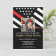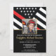 Este convite de festa de formatura apresenta uma bandeira de bombeiros com listras pretas e brancas, e uma fina faixa vermelha de linha também. Personalize com uma foto do bombeiro graduado, que se senta sobretudo nos detalhes do partido para o bombeiro graduado.