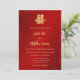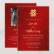 Este elegante convite para o casamento chinês mostra um símbolo de dupla felicidade de ouro artístico em um fundo floral vermelho de shimmering. Nomes de noiva e noivo em um elegante roteiro escrito à mão. Convite para casamento chinês ou convite para cerimônia de chá. Com um código qr digitalizável e uma foto na parte de trás.