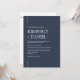 Este convite apresenta um estilo moderno minimalista com fontes de tipografia serif de bloqueio simples e limpo com fundo azul marinho. A simplicidade desta design adiciona um toque de elegância ao seu casamento. Funciona bem com muitos temas de casamento e definitivamente um excelente extra para o seu casamento. Basta personalizar os nomes e o texto em alguns passos fáceis e personalizar o cartão de convite com sua foto do casal feliz e substituir o Código QR pelo seu no verso do convite para dar um toque pessoal agradável ao seu convite. Se precisar alterar a cor, você pode personalizar o cartão de convite. Você pode personalizar e personalizar o convite para ajustado das suas necessidades de evento de casamento e clicar em personalizar o convite. Você pode personalizar facilmente este convite com seu próprio texto e compartilhá-lo com seus convidados digitalmente — seja através de texto, email ou mídia social. Se preferir, você também tem a opção de enviar uma versão impressa para seus convidados. Ou, você pode fazer ambos — enviar uma versão digital e acompanhar com uma cópia impressa para um toque pessoal!