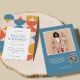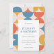 Entra num mundo de nostalgia e celebra o amor num estilo verdadeiramente groovy com os nossos Anos setenta Convite para Papel Retro-Casamento vintage! Este convite apresenta um padrão cativante inspirado pelo espírito vibrante dos anos 1970 e 1960 que combina meio círculo e vieiras. O padrão é elegantemente trabalhado numa paleta de azul, laranja e amarelo, colocada sobre um fundo clássico de náutica, criando um equilíbrio perfeito entre nostalgia e elegância. Placa inversa em um azul profundo correspondente com espaço para sua foto do Melhor noivado (ou foto do casal) e CÓDIGO QR. Muito fácil de personalizar: adicione o nome do seu convidado e os detalhes do cheio usando o modelo.