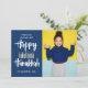 Cartão de saudação de fotos Festivo Hanukkah Holiday com sua melhor foto de retrato e "feliz hanukkah" em letras de estilo, tipografia de pincel e velas em tons de blues e amarelos. Personalize o texto personalizado com seu nome e ano. Cartões invertidos a um padrão de estrelas de fundo azul coordenado.