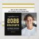 Anuncie o formando do ensino médio da turma de 2023 com estilo com este anúncio de formatura e convite de festa. Cartão frente e verso apresenta um design simples e masculino com letras inspiradas em camisetas esportivas, perfeito para o seu aluno estrela e atleta da liga. Cores preto, dourado e branco. Espaço para incluir uma foto do formando na frente com o texto do convite da festa no verso. Todas as cores podem ser personalizadas.