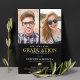 Dobre a comemoração, duplique a diversão! Um elegante convite para a graduação em conjunto com um fundo na moda preto que pode ser mudado para qualquer cor, duas fotos dos formandos, um boné de formatura falho de ouro e um modelo de dupla celebração moderno que é fácil de personalizar.