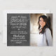Anuncie seu formando em estilo com este anúncio de graduação de fotos em estilo caprichoso que apresenta um olhar de fundo texturizado em quadro negro com texto branco manuscrito, pergaminhos e rabiscos ao lado de um espaço fotográfico de retrato. A parte de trás dessas na moda podem ser personalizadas como convites para uma festa de formatura para celebrar a ocasião.