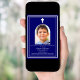 Um fundo azul marinho, decorado com uma estrutura branca, e uma cruz branca Personalize e adicione um nome de foto e detalhes. Texto branco. Quadro fotográfico em forma de arco.
