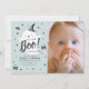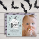 Este belo convite de fotos de 1rua/1º aniversário do "boo" do garoto de halloween apresenta um fundo azul com um fantasma fofo. O verso apresenta padrões de morcegos em um fundo roxo. Personalize-o para as suas necessidades. Você pode encontrar produtos correspondentes na minha loja.