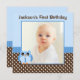 Comemore o primeiro aniversário do seu filho com este belo convite para fotos do primeiro aniversario de coruja. Apresentando uma coruja azul sobre fundo de bolinhas. Mostrado em azul e marrom.