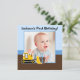 Comemore o primeiro aniversário do seu filho com este belo convite de fotos de aniversário de construção. Apresentando um trator carregador frontal e presente. Mostrado em azul e marrom. Personalize facilmente com as informações da sua festa e a foto da criança.