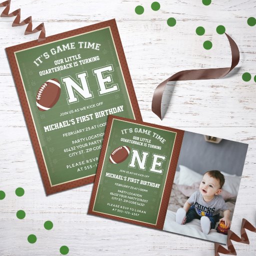 Fotografias do 1º Aniversário de Futebol! Celebre seu pequeno quarterback com este design de aniversário de futebol fofo, criado com um fundo de futebol com "UM" que tem uma bola no lugar do "O". Personalize o texto e troque a foto com sua foto dos jogadores de baile para obter um toque especial no dia especial do seu filho com esses convites de festas de aniversários de arte!