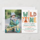 Um convite para fotos de primeiro aniversário, de cor moderna. Design apresenta fotografia de solteiro, tipografia selvagem com cabeça de tigre em cores de safari de tendências e detalhes de festas. Perfeito para a primeira festa de aniversário.