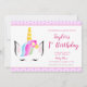 O Unicórnio é toda a raiva, o convite de aniversário deste miúdo não é exceção. Personalize e personalize o convite de aniversário de 1rua (o primeiro) da sua menina apresentando a minha ilustração de unicórnio fofa, de cabelo arco-íris. Com padrões de flores roxas e fundo rosa. Inclua uma foto no verso para compartilhar quanto seu filho cresceu.