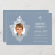 Este elegante e empoeirado primeiro convite à comunhão, azul e prateado, com ar vintage, recomendado para um menino, tem à esquerda um quadro floral vintage como uma crista, de folha de prata falsa, com uma foto de menino. À direita, há o texto, com uma cruz falsa de prata por cima. O nome do garoto está escrito em um roteiro caligráfico elegante. O texto tem uma cor semelhante à crista falsa de prata. O fundo é azul empoeirado. A crista floral vintage de uma antiga ligação ao cobrir, do livro "Rust, Smut Mildew & Mold", de 1870, agora no dominio público.