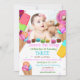 Um design de ilustração de sorvete bonito e colorido com amostras brilhantes de sorvete em cones de açúcar e macarões e rosquinhas coloridos espalhados ao redor da borda do convite, que tem um confete arco-íris, e que formam um quadro em torno de sua linda foto do Childs. Existem modelos de script fofos para o seu texto personalizado e o verso tem espaço para detalhes adicionais, se necessário.