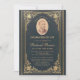 Este elegante convite para o funeral com um ar vintage tem um quadro de ouro vintage com decorações elegantes de ouro barroco em um fundo azul escuro como couro. Há uma foto marcadora em um quadro oval na parte superior, com texto arquivado acima dela. O nome é escrito em um roteiro caligráfico elegante. Todo texto pode ser personalizado e tem uma cor de ouro semelhante à decoração dourada do quadro. A foto marcadora, um retrato antigo da sepia de um jovem de 1882, está no dominio público; foi oferecida por Jody LaGreca na Dominio público Pictures. Você pode substituí-la por qualquer foto normal, ela aparecerá como redonda (oval) no convite. O pano de fundo com suas elegantes decorações de ouro em azul escuro é de uma coleção de cobrir de livros franceses, de Georges Mercier (1885-1939) - Madame de Maupin por Teophile Gautier, volume 1, edição 1911, Paris - agora no dominio público, da Biblioteca Pública de Nova York.